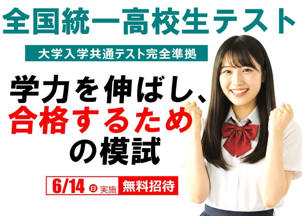 2026年4月10日 / 最終更新日時 : 2026年3月28日 nagai_ide お知らせ 6月14日(日)実施:全国統一高校生テスト申込受付中! 全国統一高校生テストのご案内です!◆全国統一高校生テストの特徴 ①最大16ページの詳細な成績帳票を返却! ②中5日でスピード返却! ③大学入学共通テストに対応した問題! ④一流講師陣による解説授業で復習ができる! ⑤全国47都道府県1,100以上の会場で一斉実施!【日程】 6月14日(日)・6月22日(日)【対象】 高3生・高2生・高1生・高0生 ※高0生…高校生レベルの学力を持った中学生【受験料】無料招待※出題範囲等、詳細はこちら※時間割はこちら